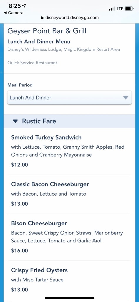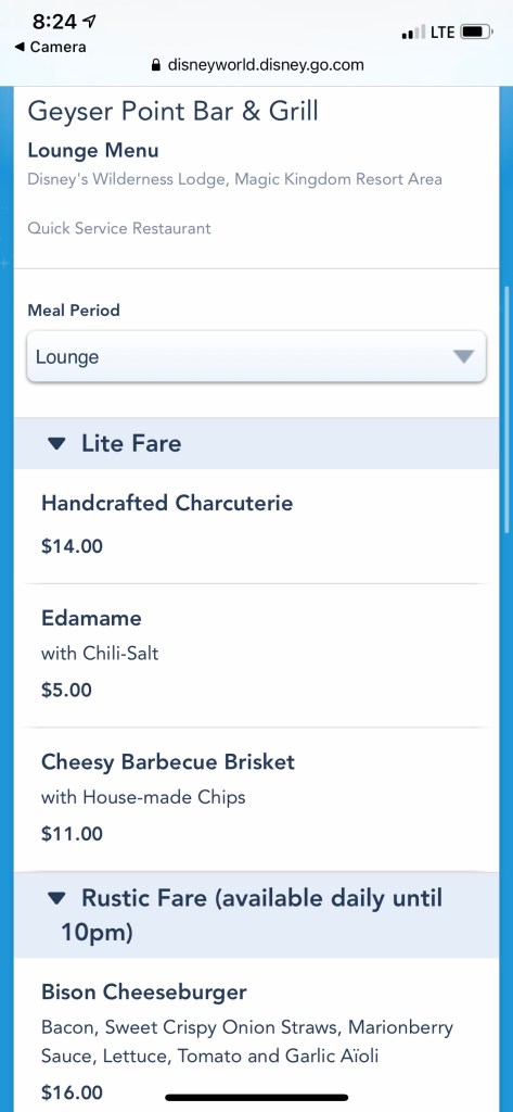 We had spent the evening at Magic Kingdom. The quick service dining locations were either closed or were getting ready to close. We decided to check out Geyser Point Bar & Grill, located at Wilderness Lodge (which is where we were staying.). We were exiting the park and on the boat at 7:55 p.m. Just as we were getting to the Wilderness Lodge, the heavens opened up and it was a complete monsoon! Luckily we were under cover at Geyser Point. We were told there was a 40 minute wait. We ended up only waiting 15 minutes. Every table was full! Besides normal tables, this location also has some more casual seating and bar seating.