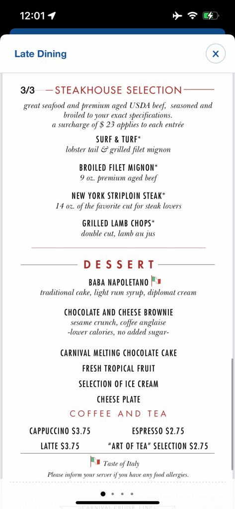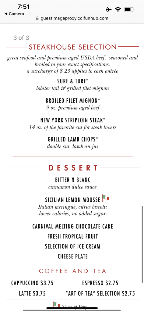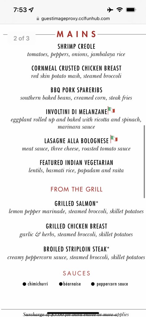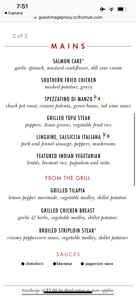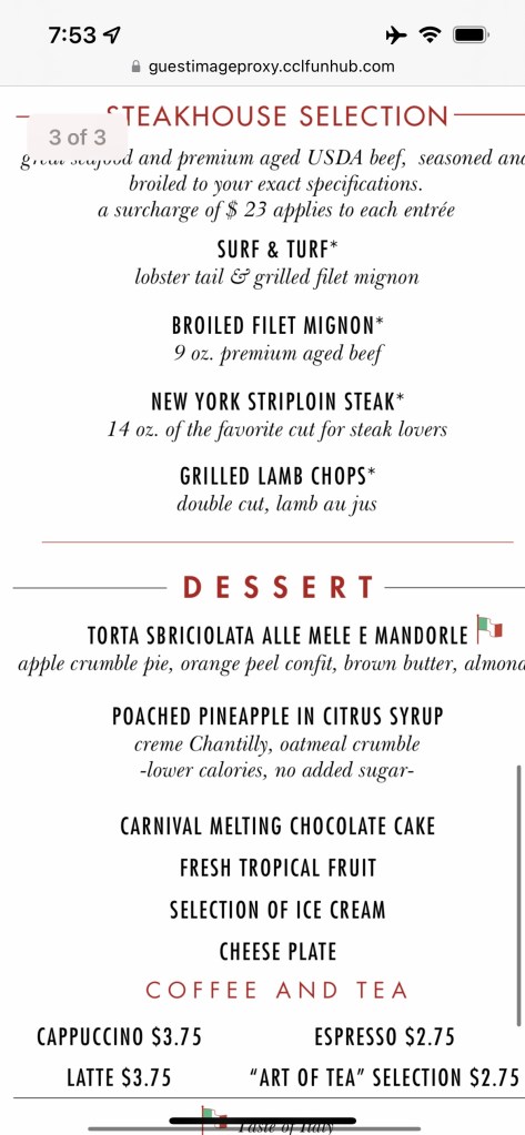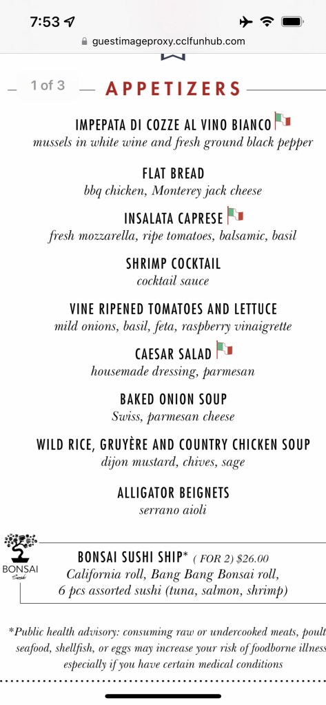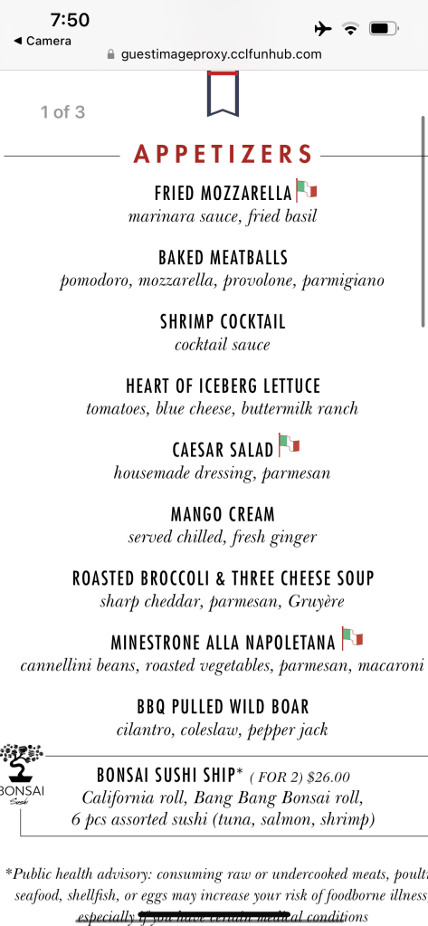 I also wanted to note that this ship’s motto is “Fun Italian Style.” And on each menu for dinner, the Italian dishes were noted with an Italian flag next to the dish.