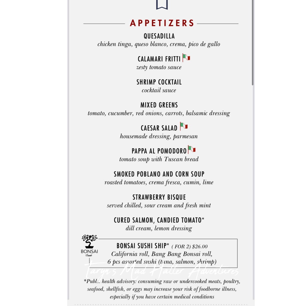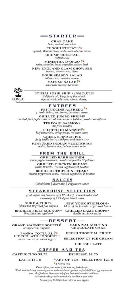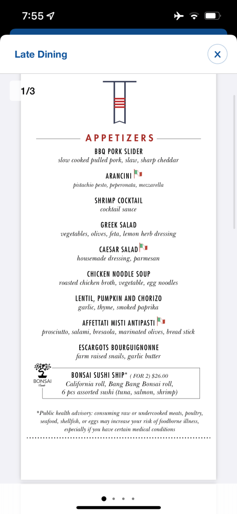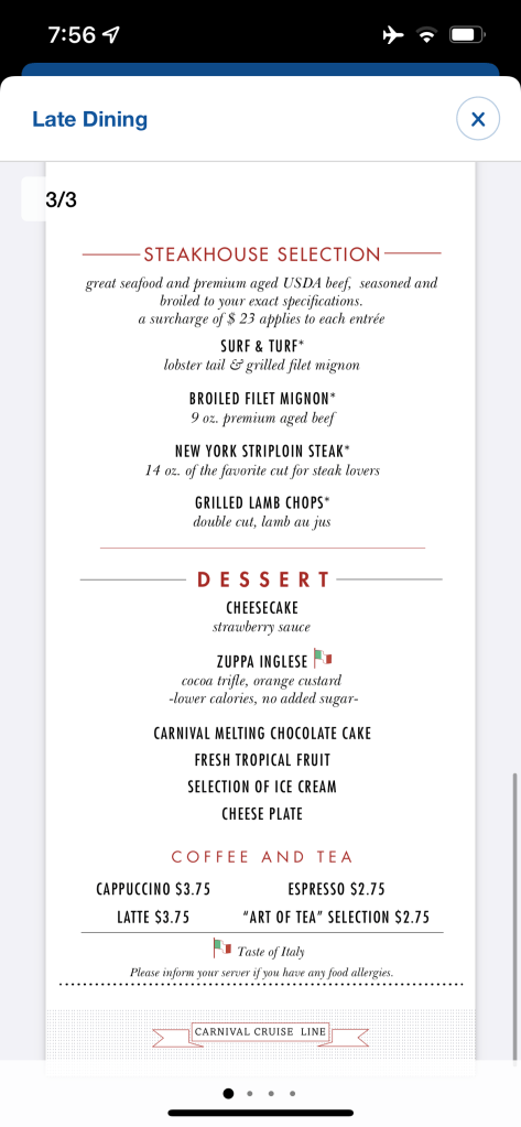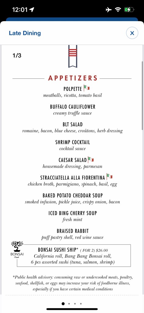 I also wanted to note that this ship’s motto is “Fun Italian Style.” And on each menu for dinner, the Italian dishes were noted with an Italian flag next to the dish.