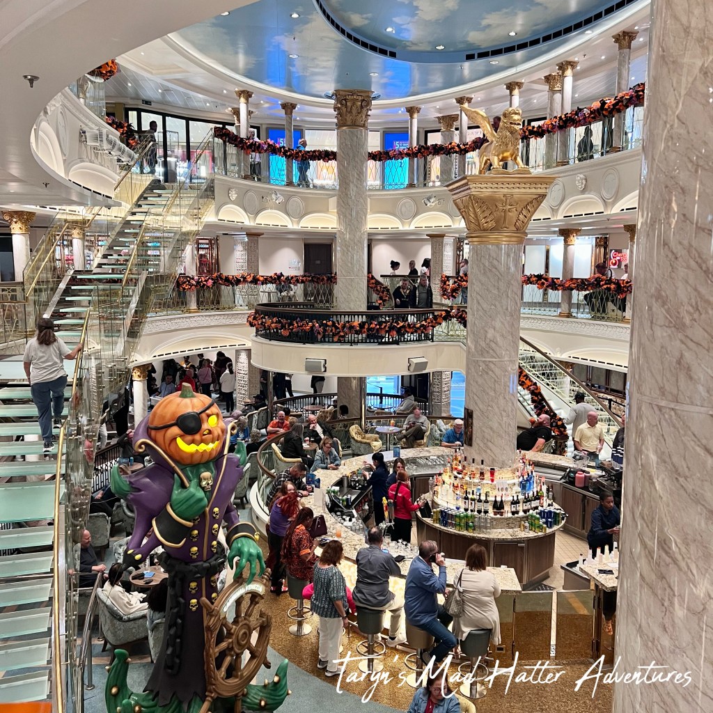 We took a little nap before heading out. We wanted to go up to deck 10, the Lido deck, for the Sail Away Party. On the way, I had to take this pic of the lobby! SO festive for Halloween.