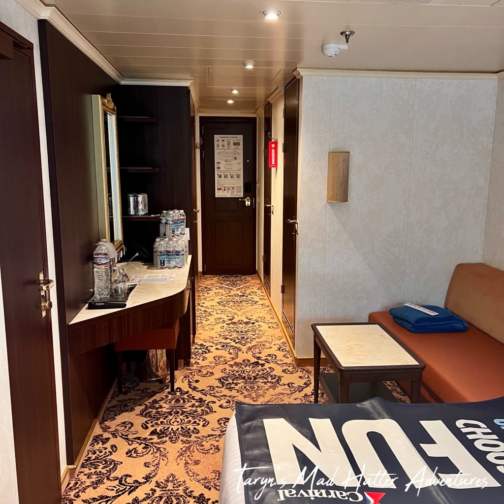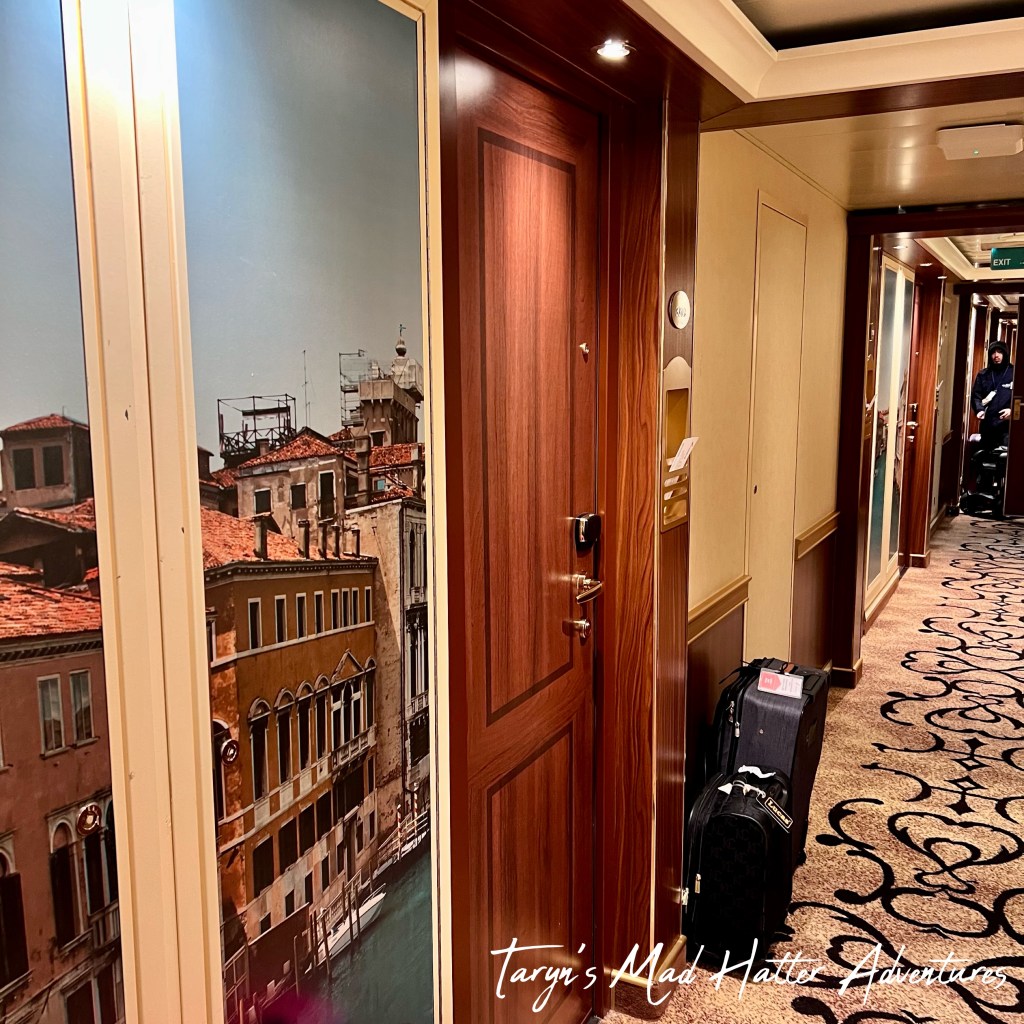 This is what the hallway looks like. Luggage that was checked with the porters prior to entering the ship was being delivered. It’s put in the hallway just outside of your stateroom.