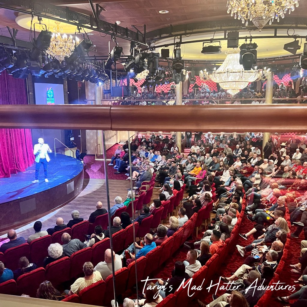 After dinner, we went to the Welcome Aboard show in the theater. The cruise director was hosting. He told us there were 4,123 passengers on board, and 380 of those were children under the age of 18. We also got a small glimpse of the performers for the week while they put on a little show for us.