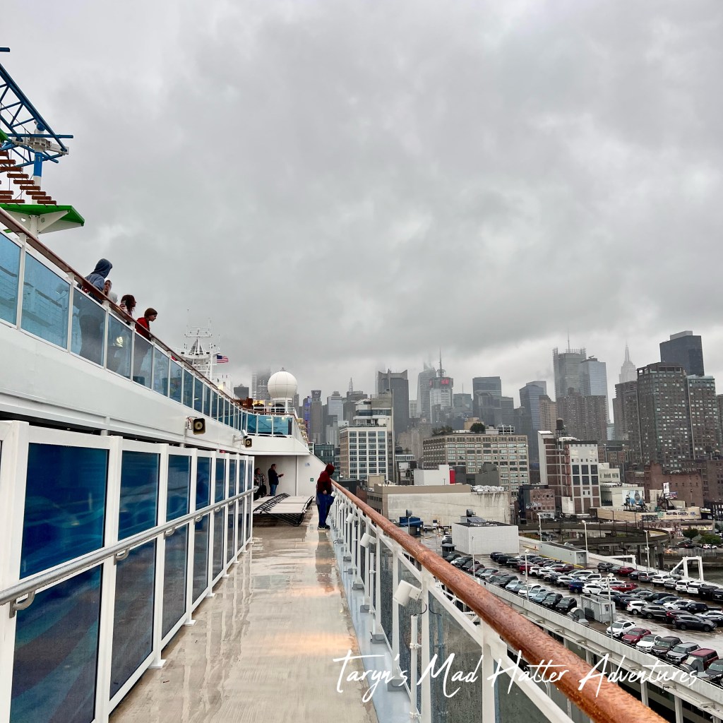 We left the airport at 9:25 a.m., right on time. We were due to arrive at the Manhattan Pier at 12:10 p.m. We did not stop at the Clinton stop for some reason, there was no traffic prior to entering the city at all, and we were in Manhattan by 11:05 a.m.! It rained the entire drive, and it was still raining when we arrived. During my online check in, I selected 12:00-12:30 p.m. time slot for getting onto the ship. I didn’t know what this meant for us when we got to the terminal.