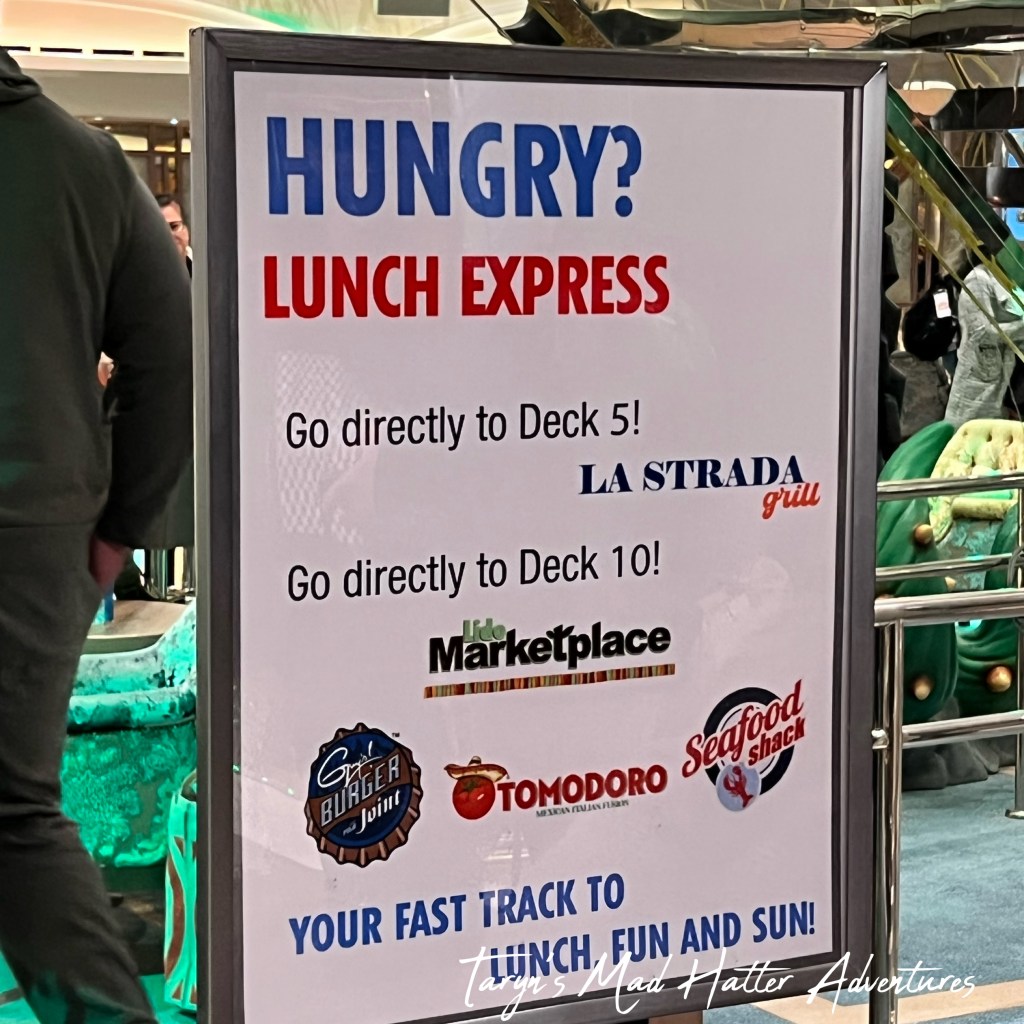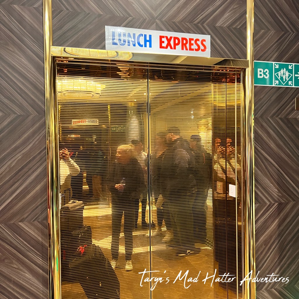 Once on the ship, we went directly to the elevators. I was happy to see a “Lunch Express” elevator that went directly to Deck 5 or 10 only. Embarkation day is always crazy. Many people have luggage with them, and cabins are not ready until later in the afternoon, so it feels extra busy and crowded. In this express elevator, they had a staff member controlling it. I don’t recall ever seeing this on any other cruise I have been on, but it was nice!