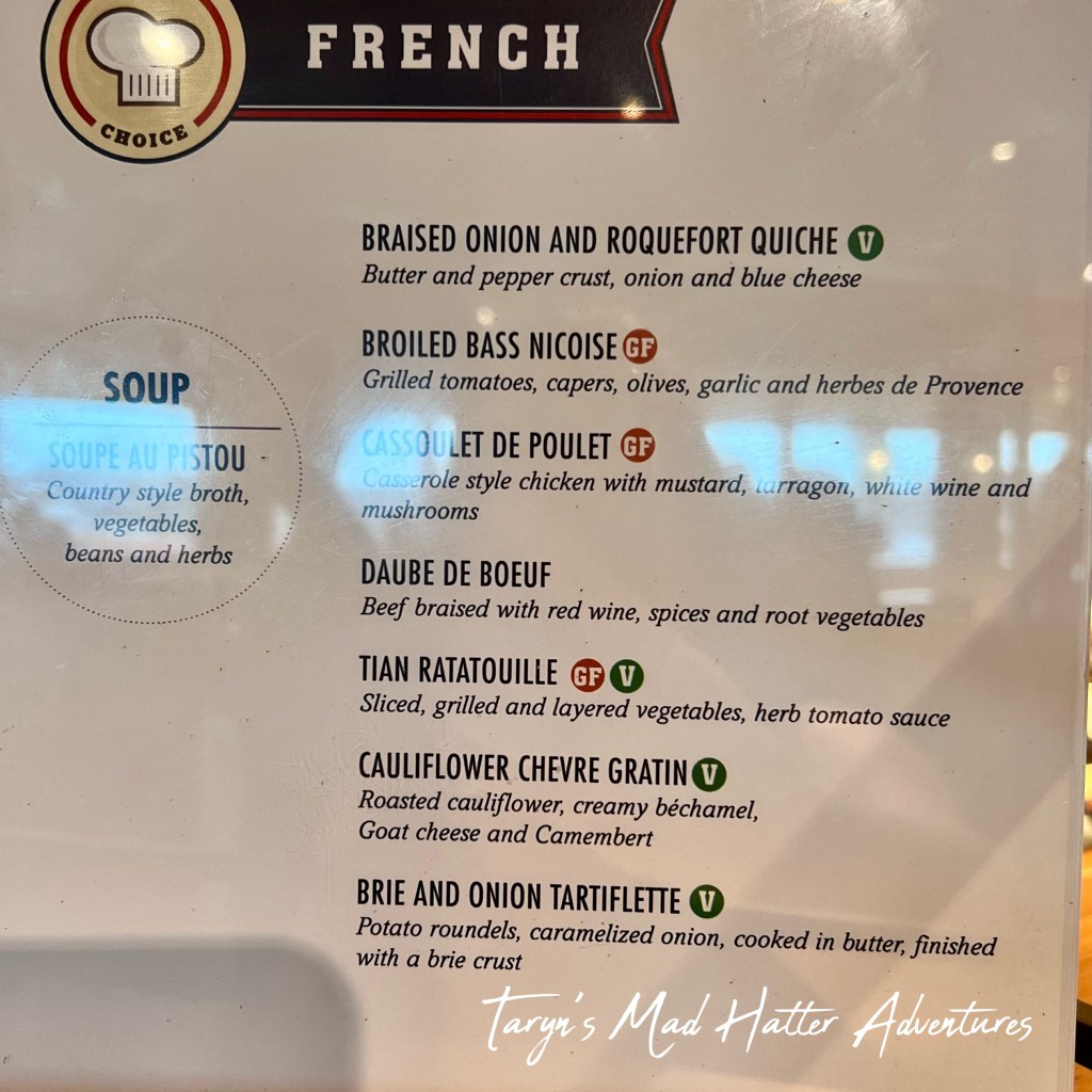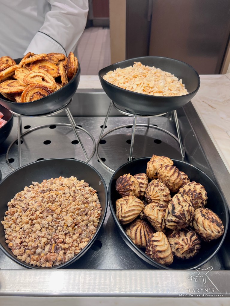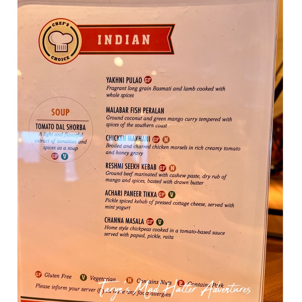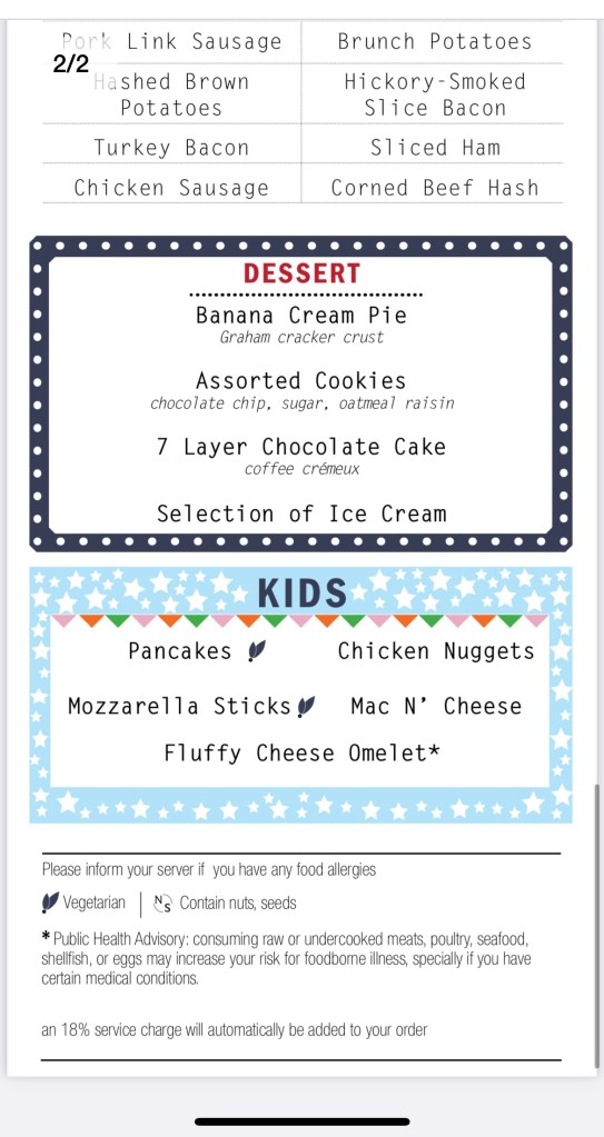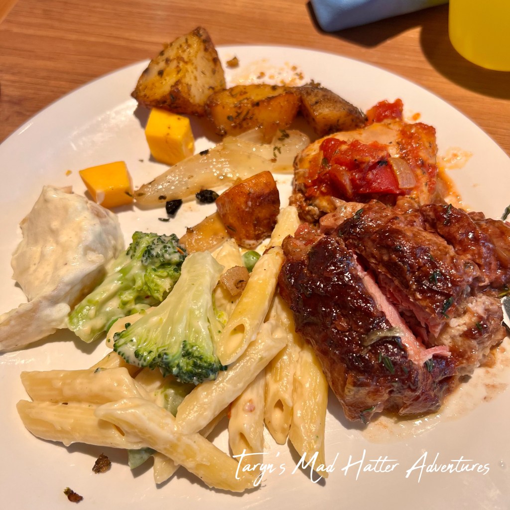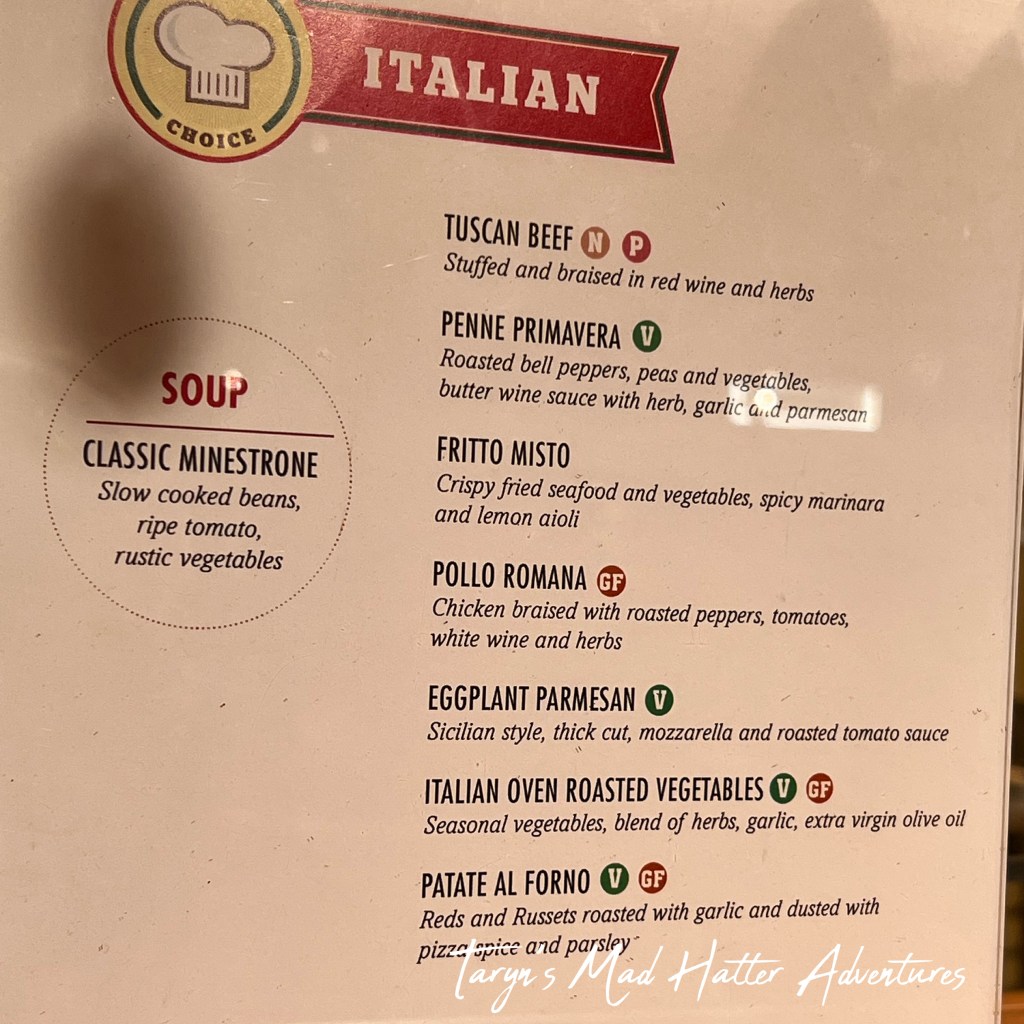 There were many good choices on the Italian themed buffet. (Each day would be a different theme.) We didn’t know at this point that there were actually 4 different buffet lines. And we also didn’t know that the lines served different food (2 served one menu, and the other 2 served a different menu). One thing I can tell you with absolute certainty is that the desserts at the buffet were AMAZING! SO GOOD. And several different choices. It was so crowded, I was not able to get any videos on this day of the buffet! I was lucky to get a pic of this menu!