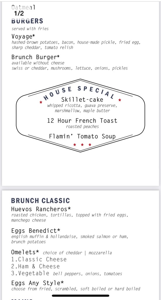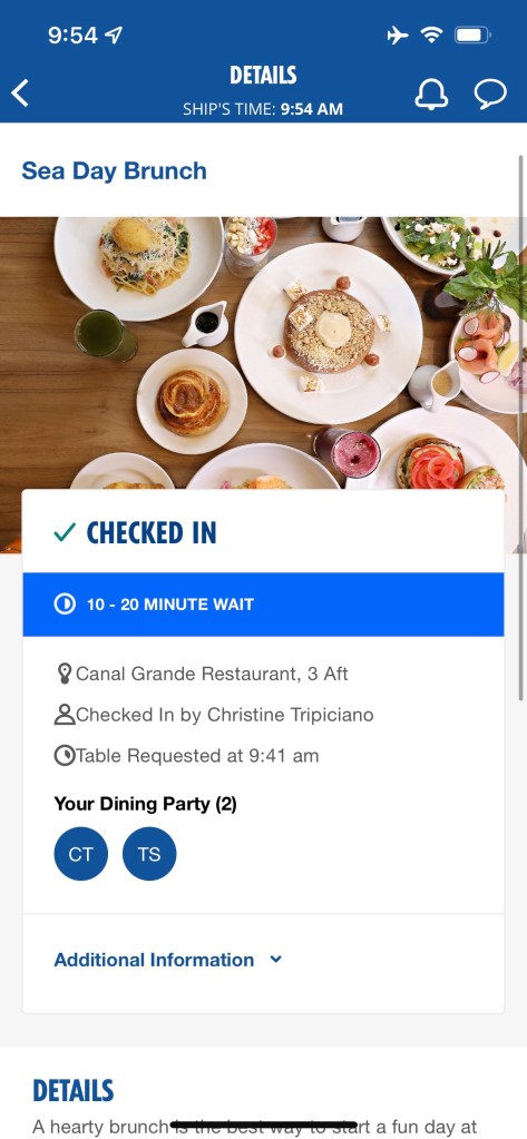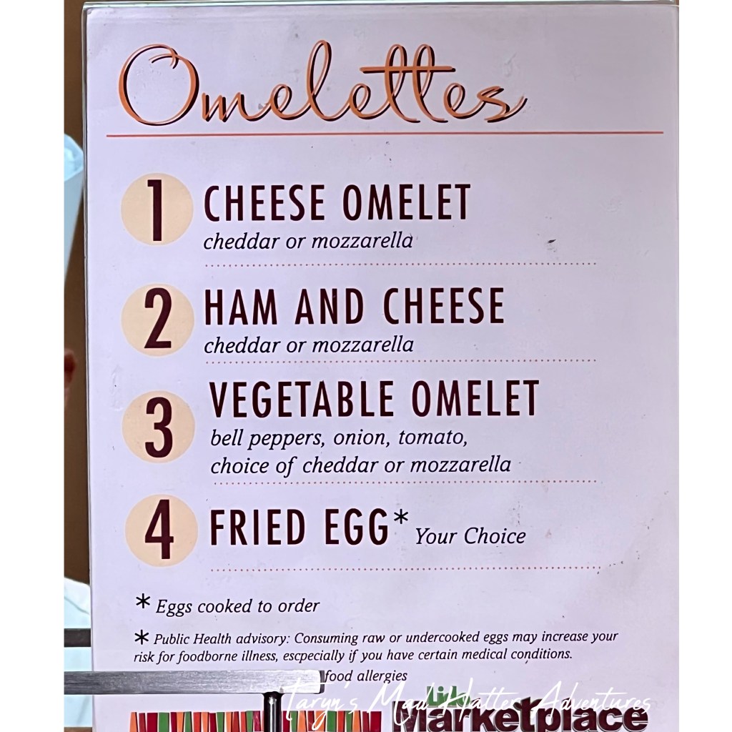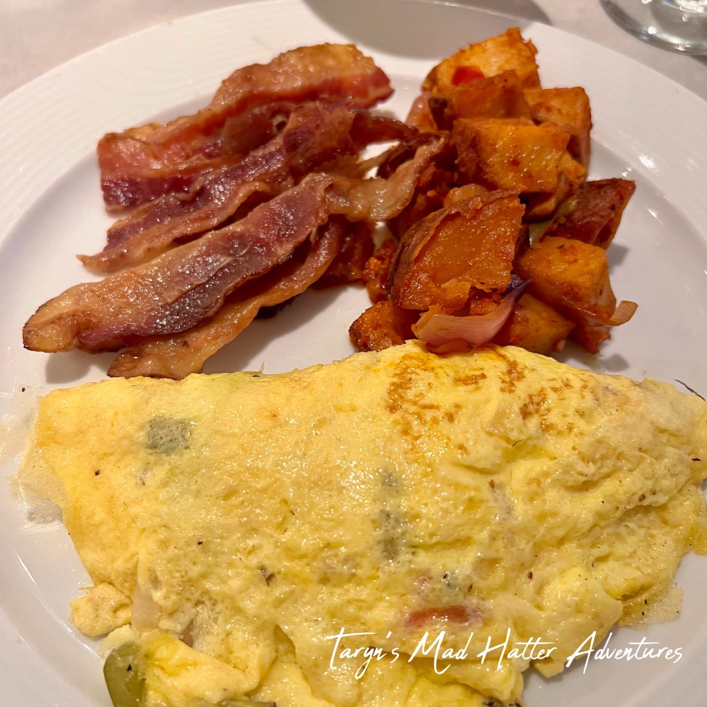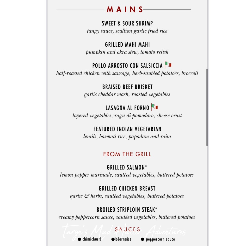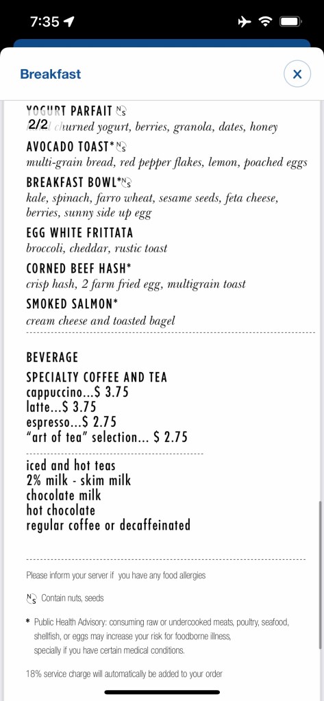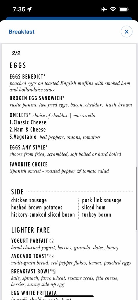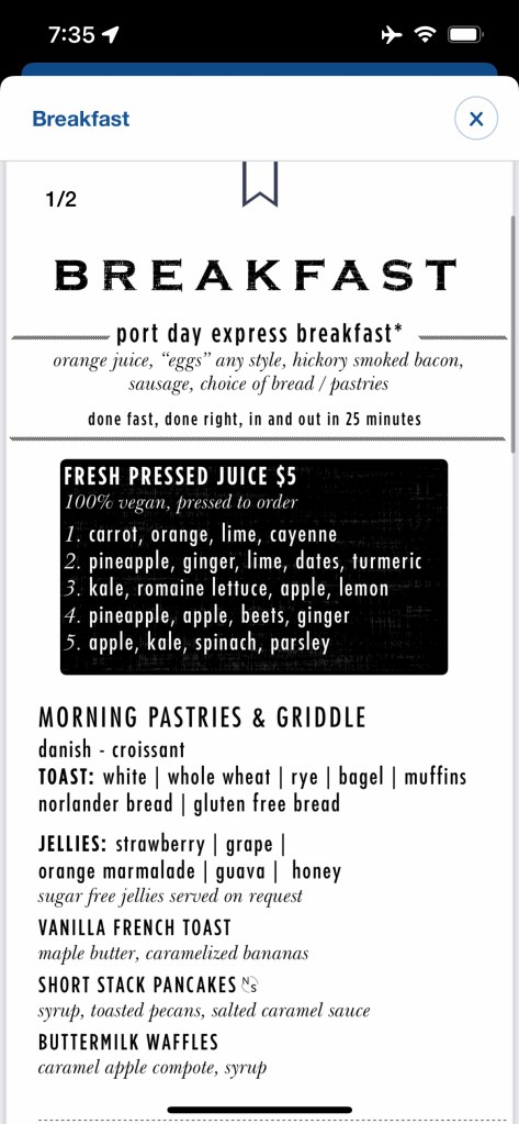 We were up early today because we were going to be getting off the ship for an excursion. We went to breakfast at 7:45 a.m., as we were getting off the ship around 8:30-8:45 a.m. We ate in the Grand Canal Restaurant. We did make a reservation on the app and the wait time was under 10 minutes. It was the same menu I posted for a previous morning.