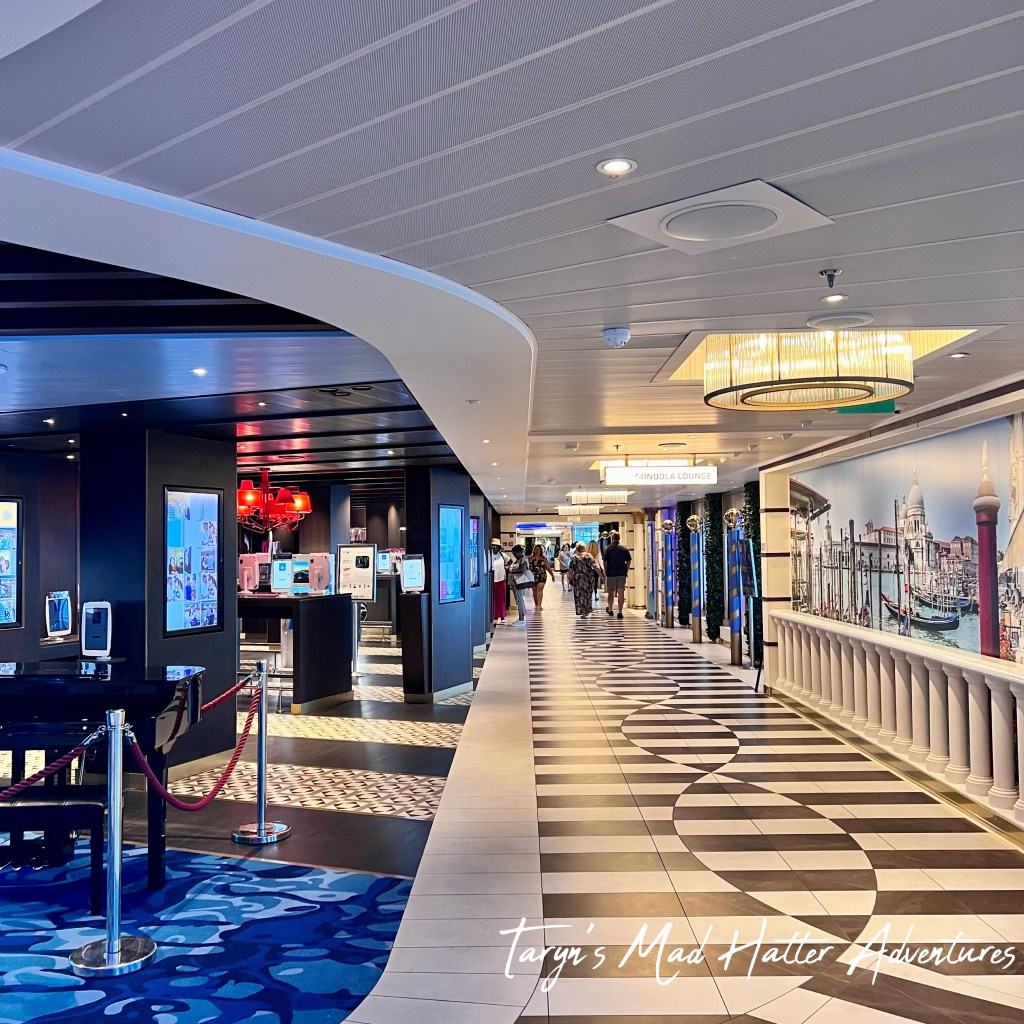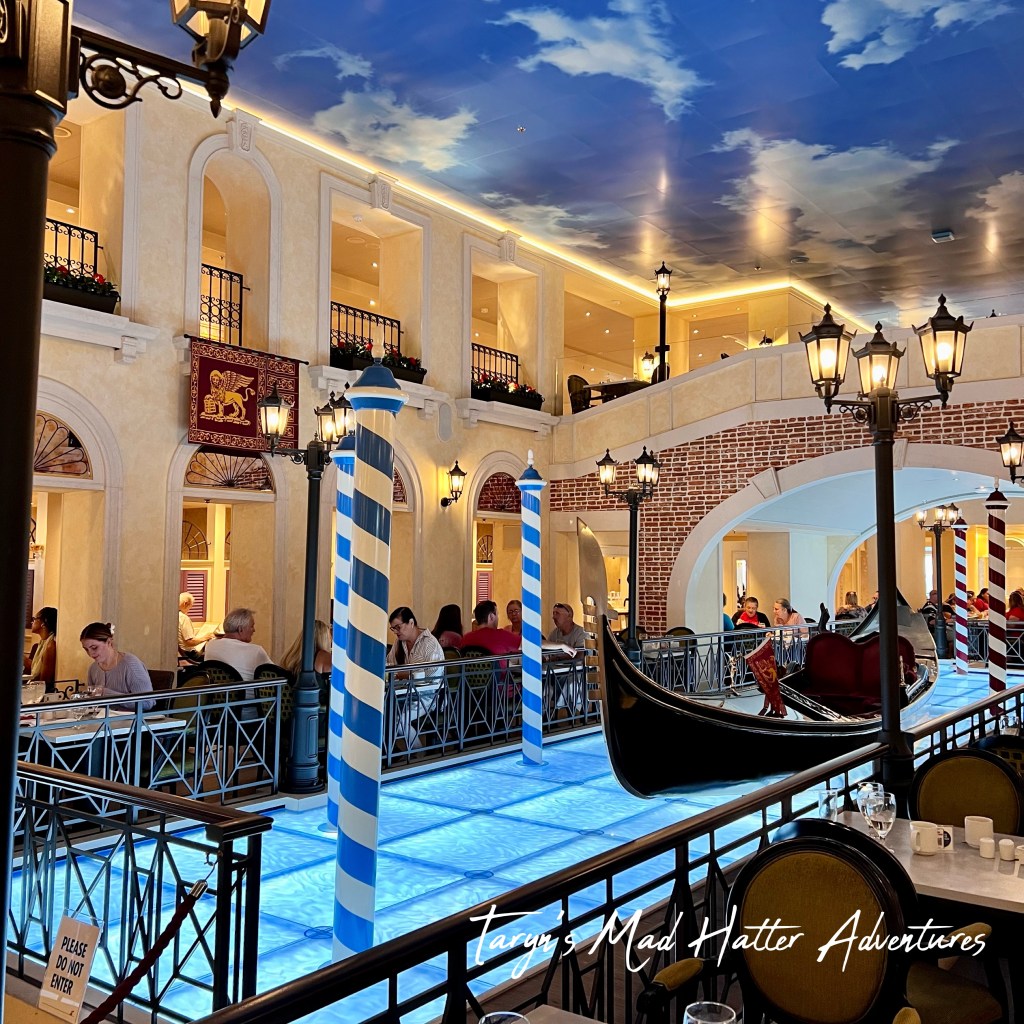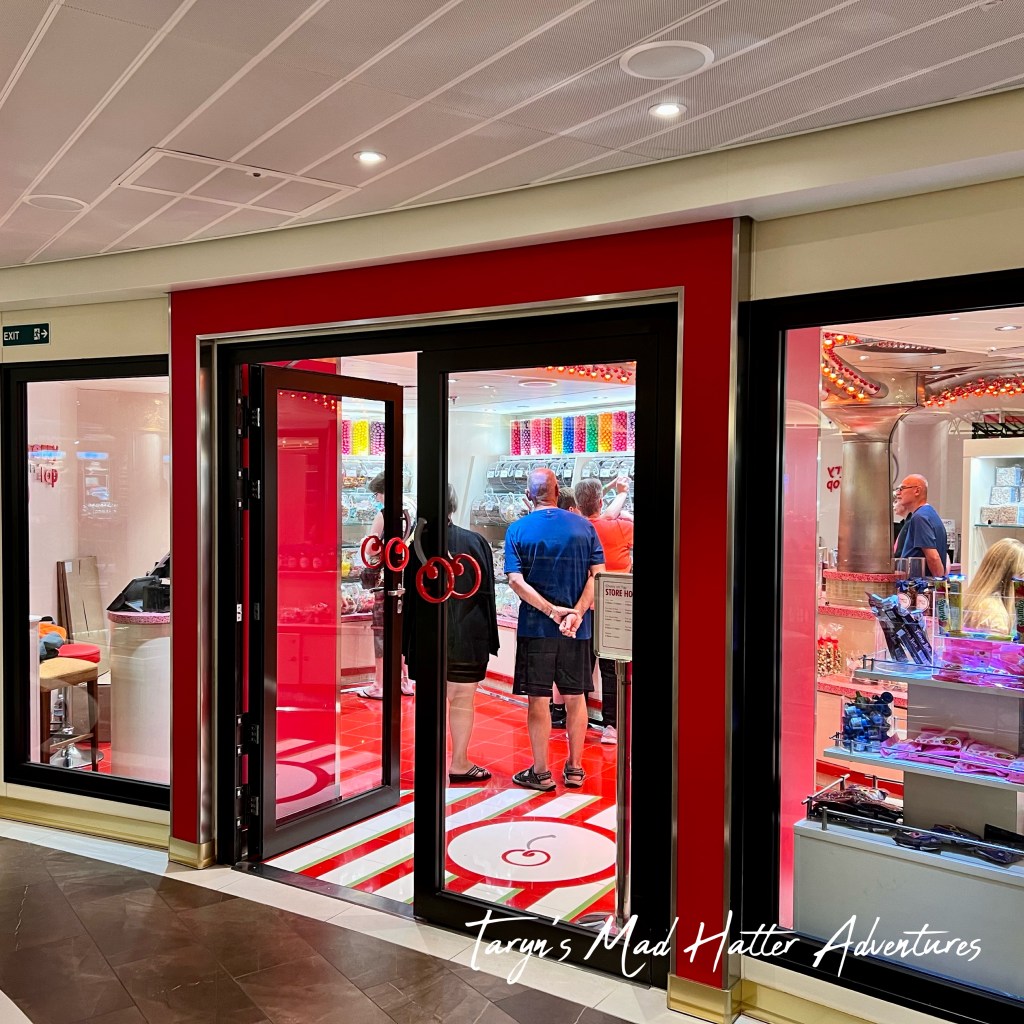Today was a day at sea. We slept in and decided to try the Sea Day Brunch in the Canal Grande Restaurant. You can use the app to make a reservation, and then it will alert you when your table is ready. It does tell you how about how long until your table will be ready (10-20 minutes, 20-30 minutes, etc.) and then once it alerts you, you have 10 minutes to get to the restaurant. We made the reservation and then headed that direction. On the way, I took some pics of some shops.