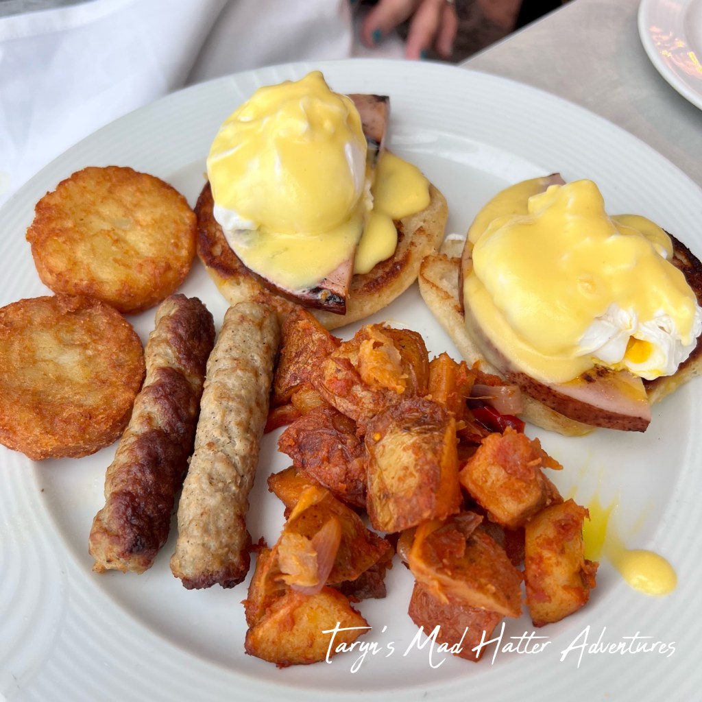 Chrissy got the eggs benedict, sausage, and hash browns.