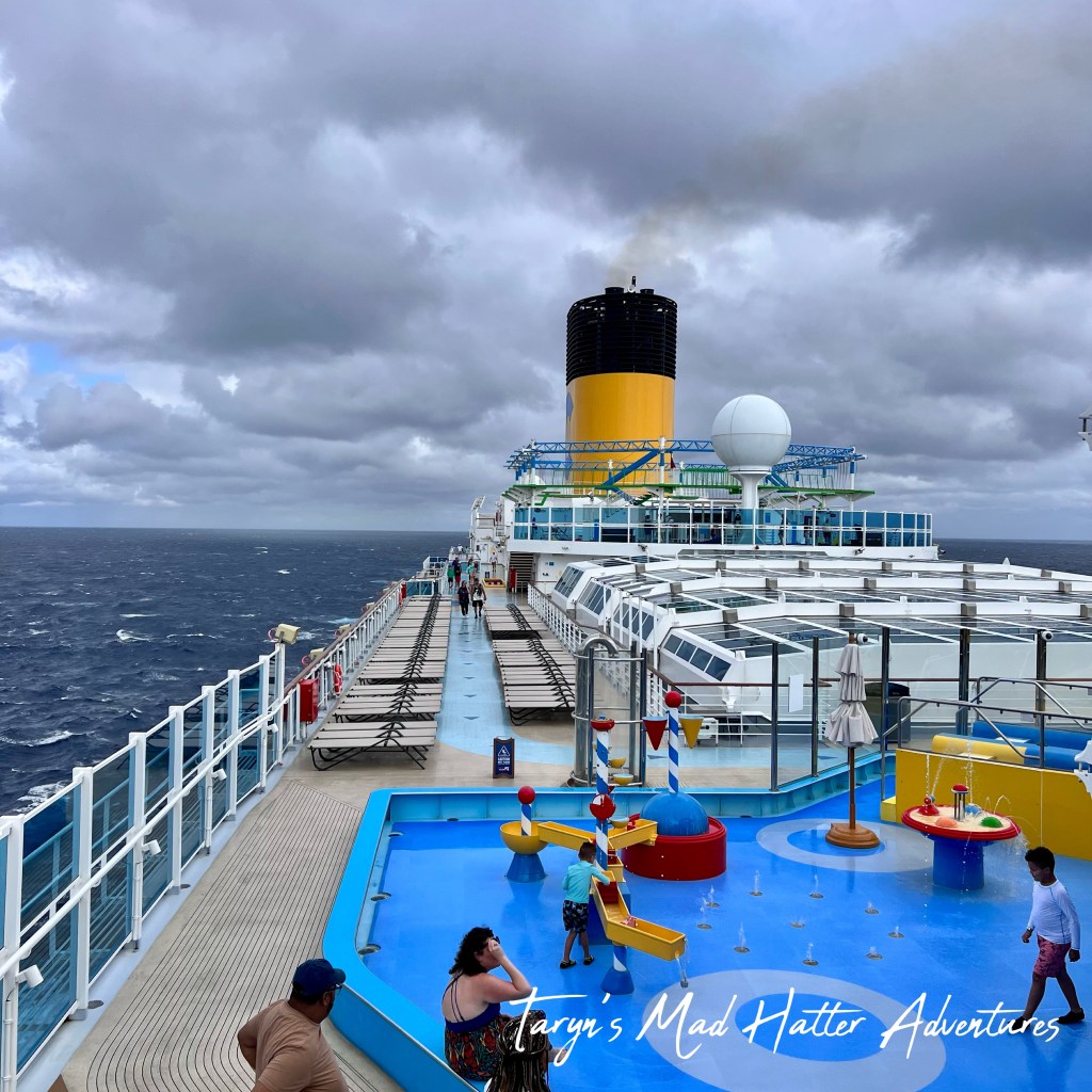 The Sail Away Party was next to the pool area on the deck, however the roof was not open because of the weather. It was raining and cool. We had the privilege of having DJ Cue! He is actually my favorite DJ I’ve ever had on a cruise! He played such a variety and some 90s oldies that I love. We also got to meet the cruise director at this time.