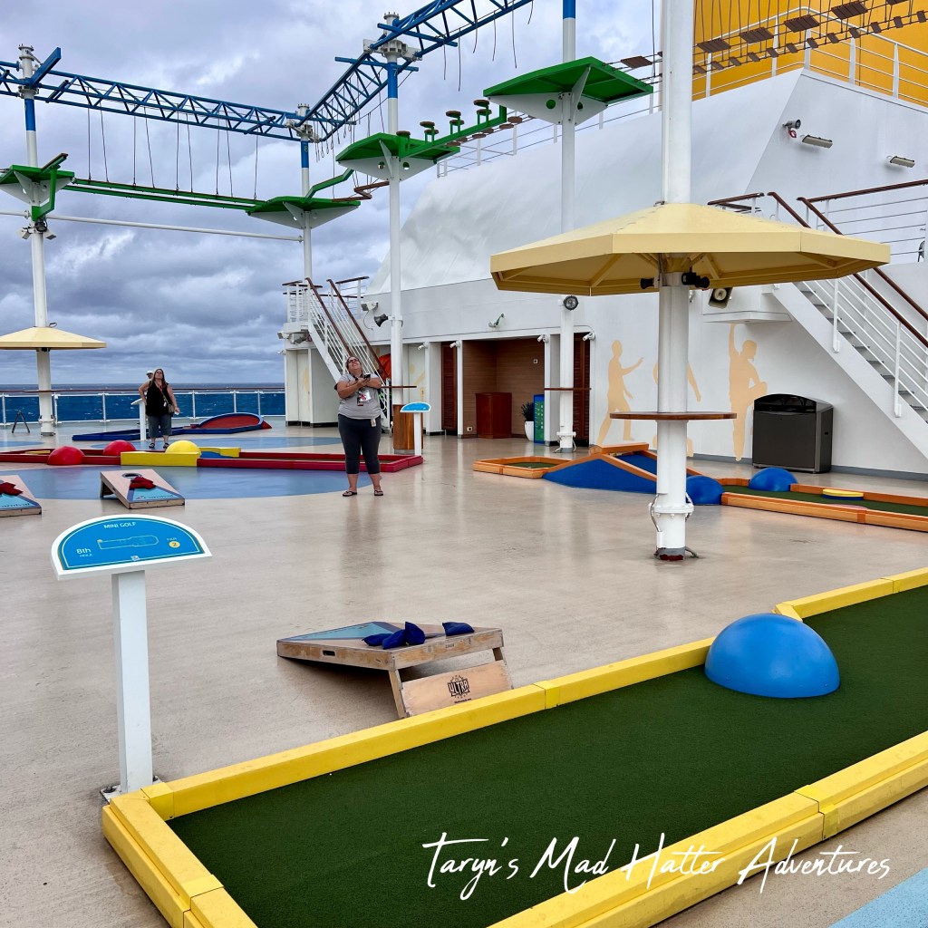On this deck you can find outdoor fitness machines, the jogging track, mini golf, The Warehouse (arcade), and the Waterworks (waterslide and water play area).