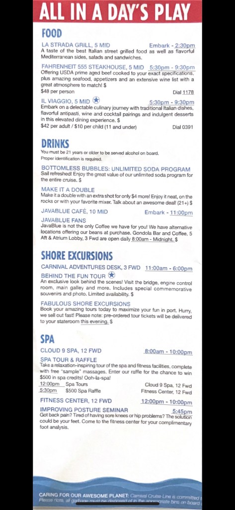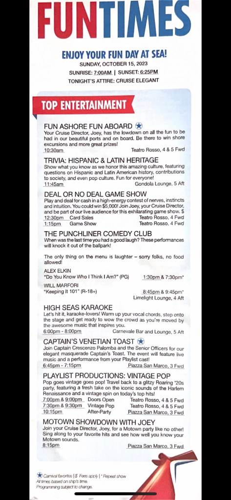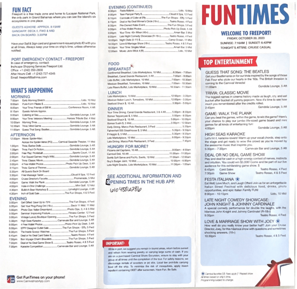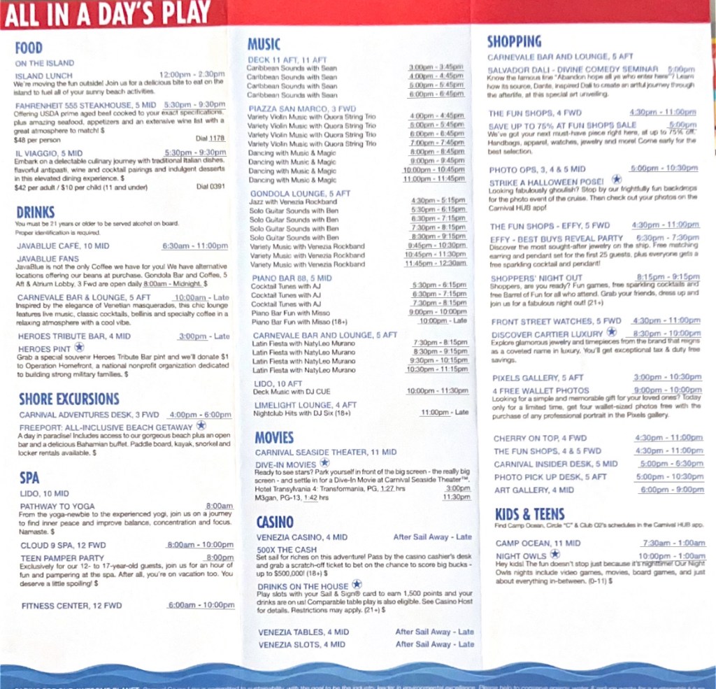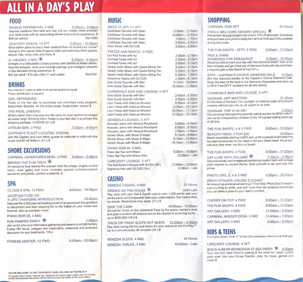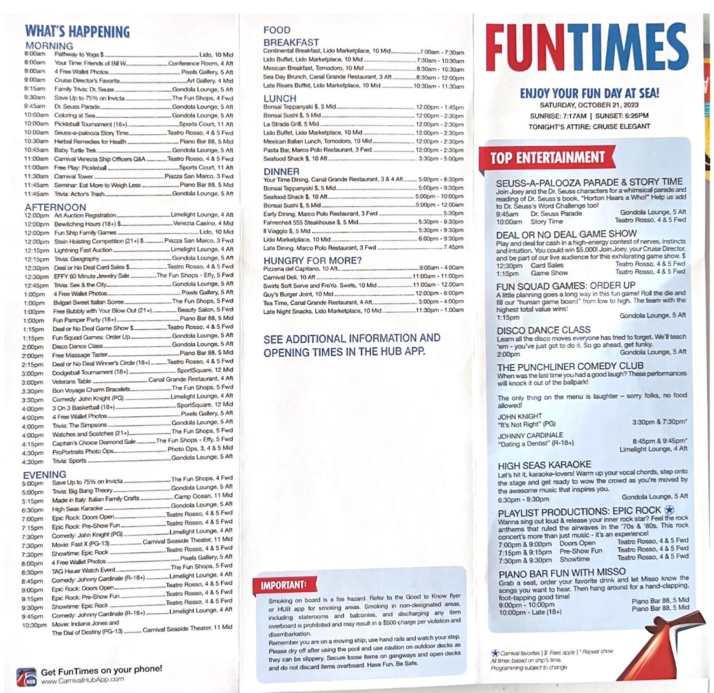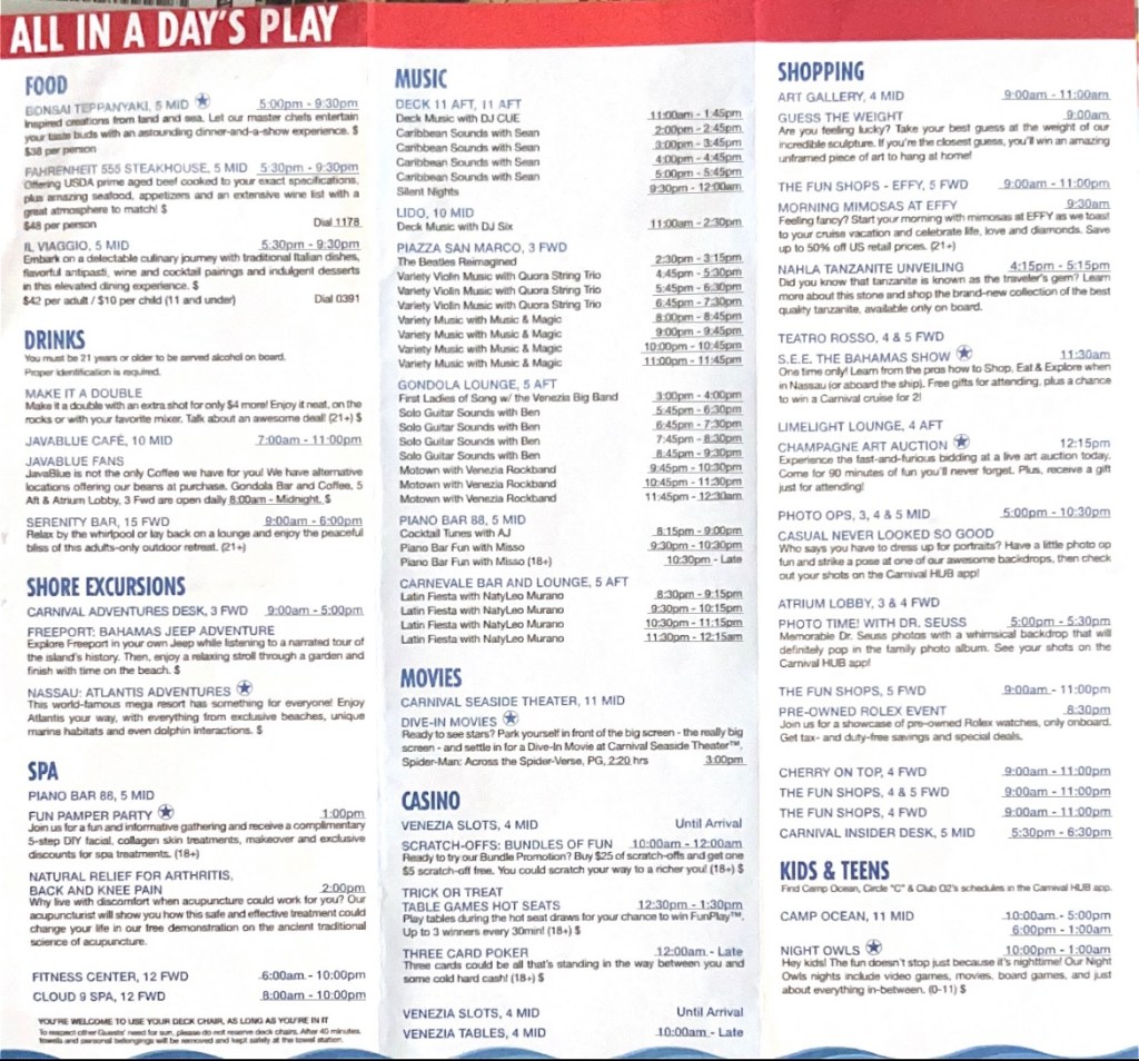 Each day, you are given a copy of Fun Times, which lists all of the activities going on on the ship for the day. There’s information about dining, shows, music, etc. This is all available on the app as well.