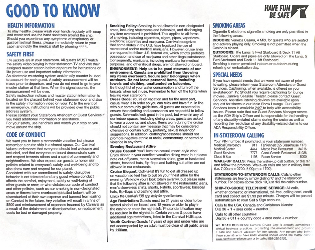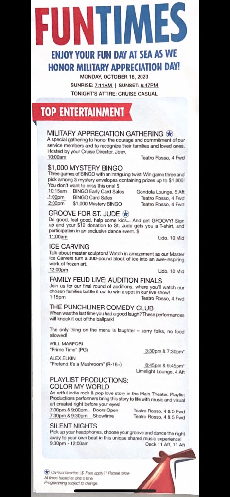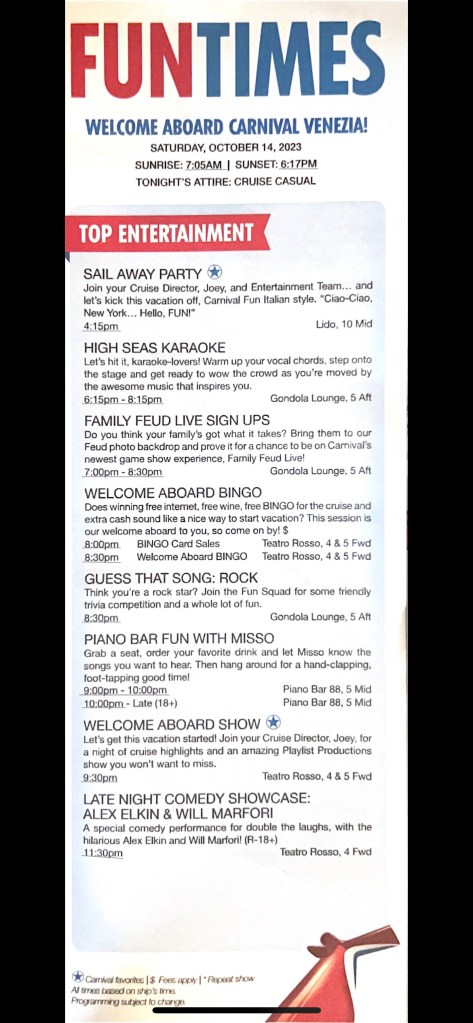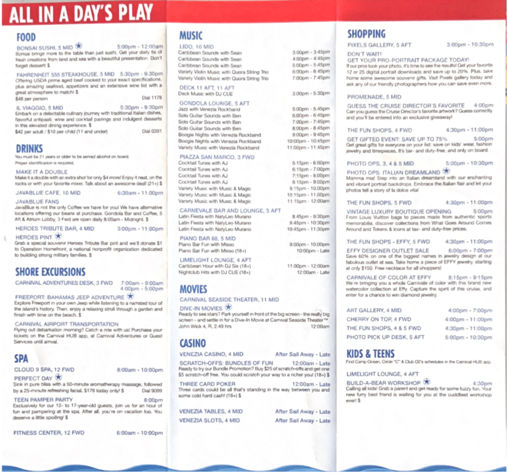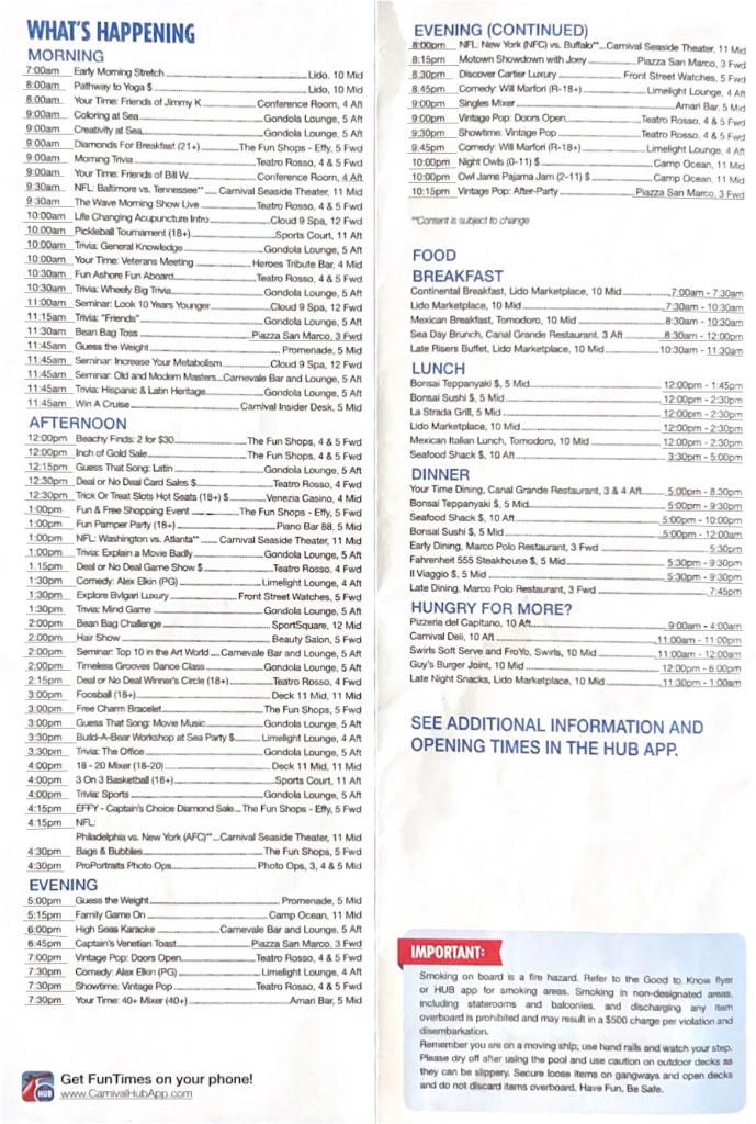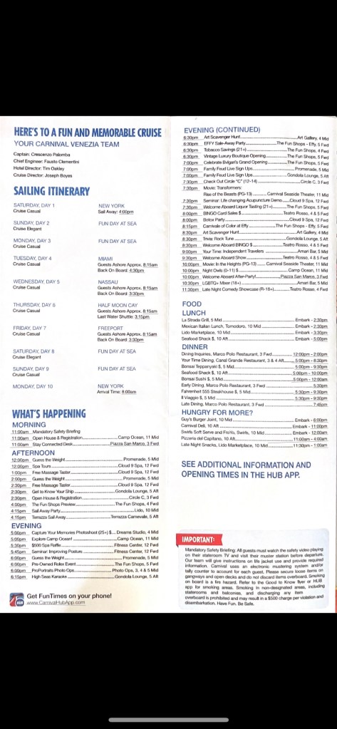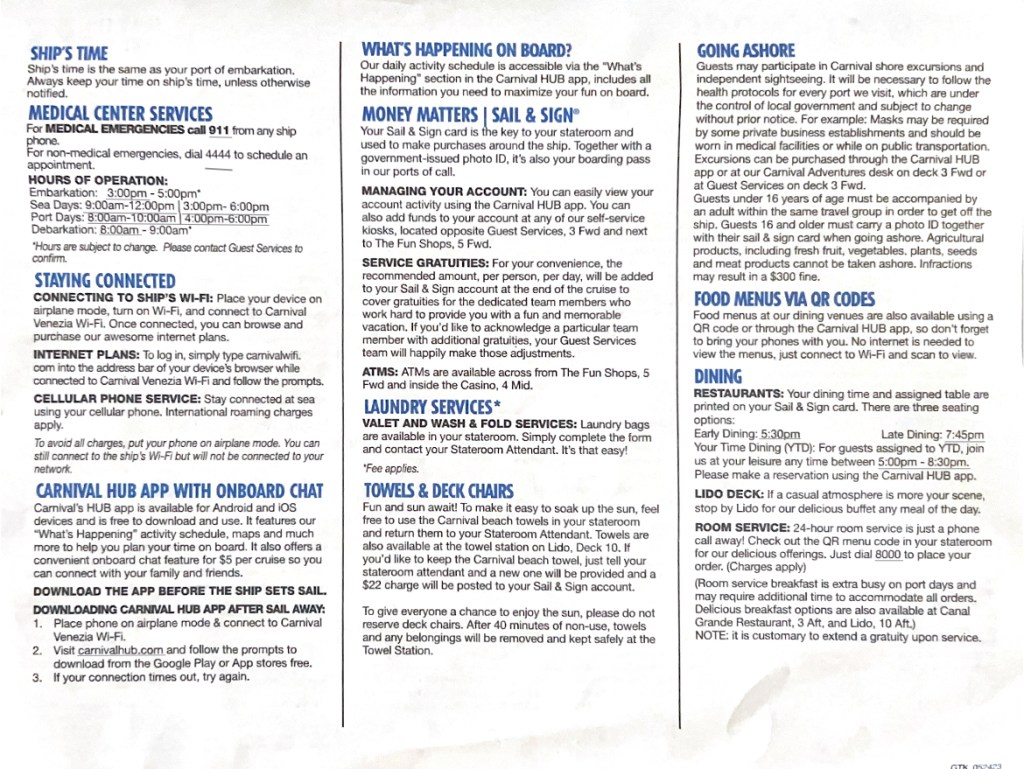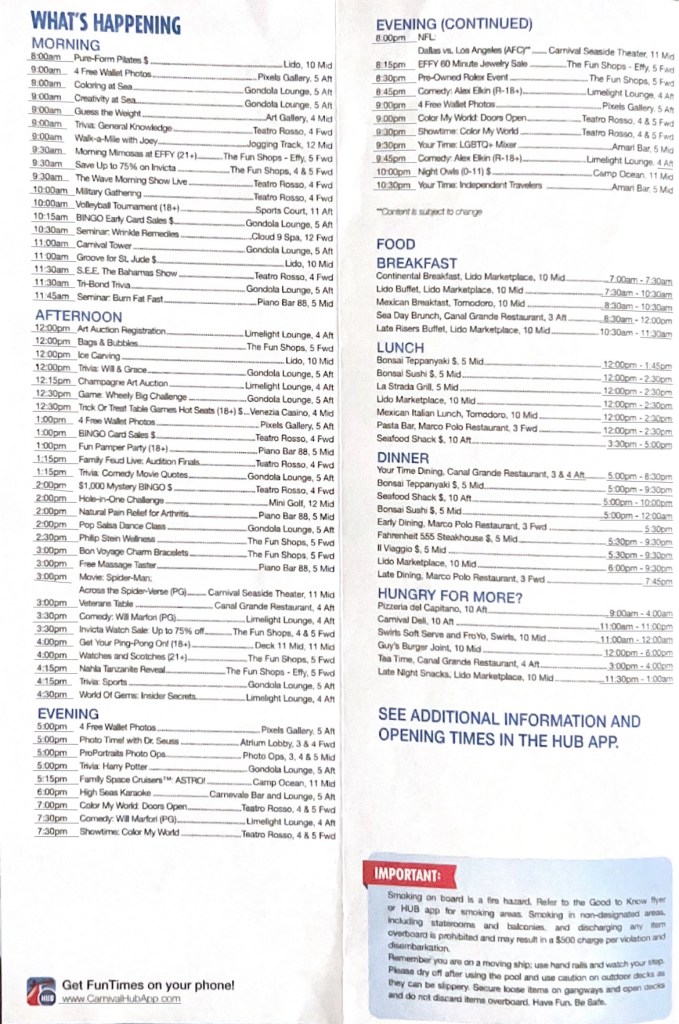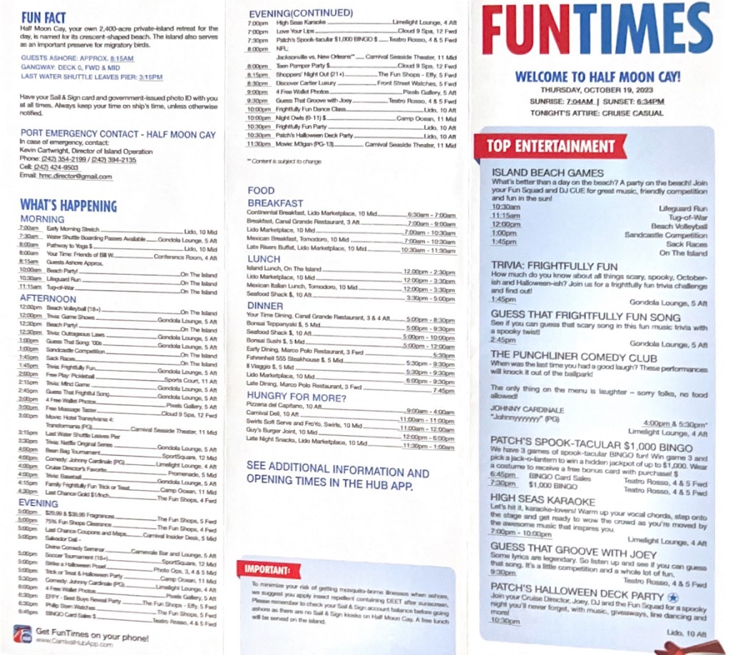 Each day, you are given a copy of Fun Times, which lists all of the activities going on on the ship for the day. There’s information about dining, shows, music, etc. This is all available on the app as well.