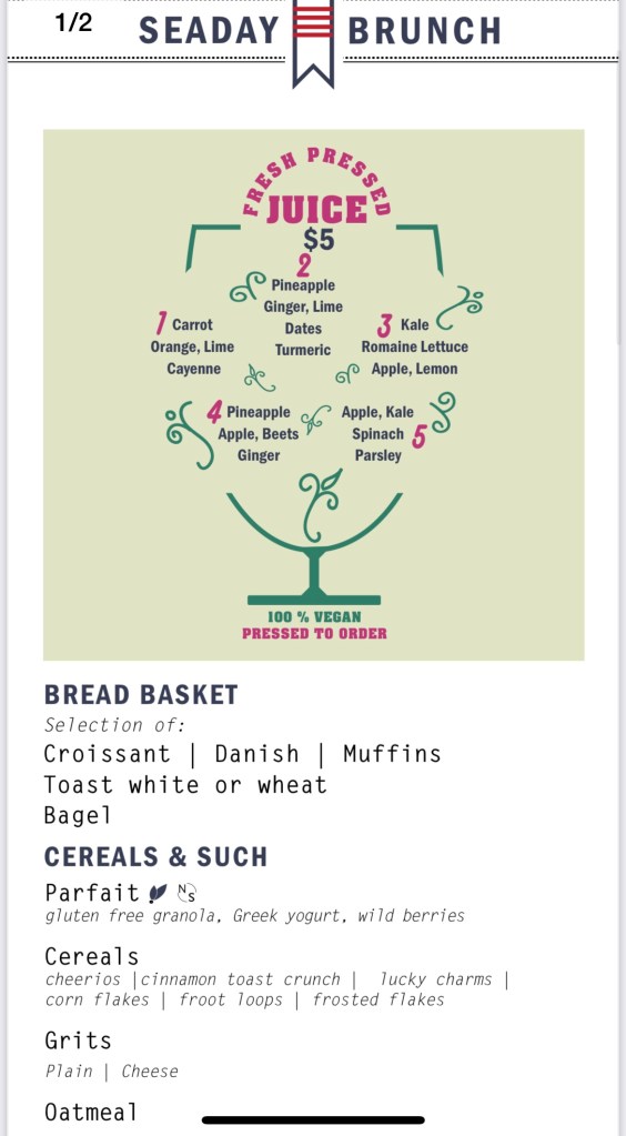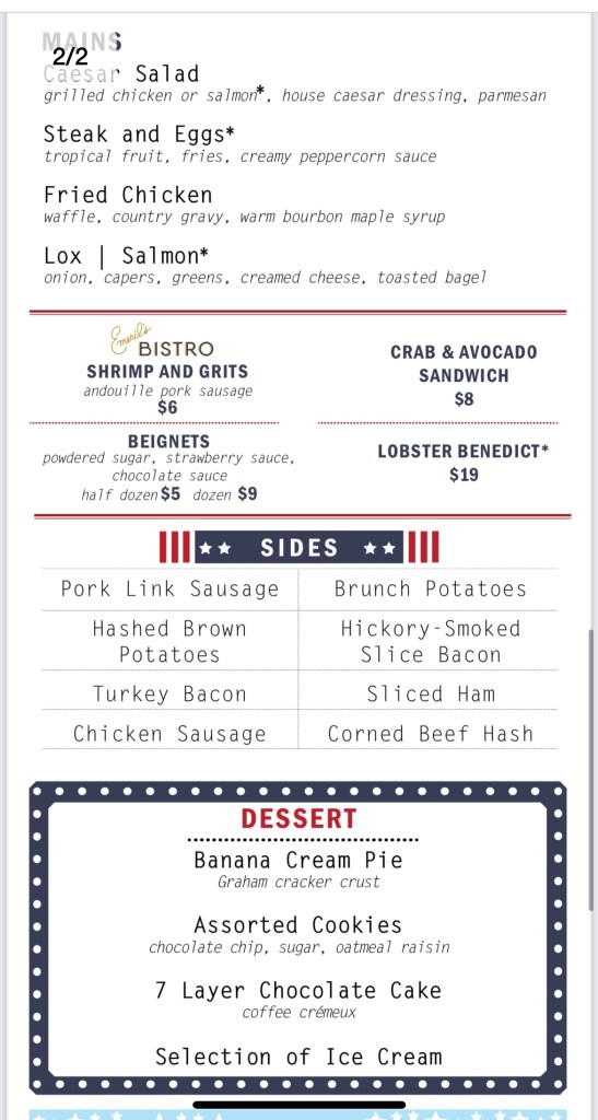 At 10:15 a.m., our table was ready! Sea Day Brunch in included with the price of your cruise. There are a few upcharge items, including Fresh Pressed Specialty Juices, and a few Emeril’s Bistro Specialties. You can see prices next to those items in the menu.