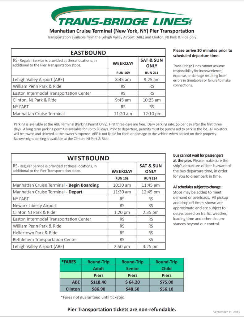 In researching my transportation options, and thanks to a Facebook group, I was able to find Trans-Bridge Lines. This bus travels roundtrip from the Lehigh Valley International Airport to the Manhattan Pier (which is Pier 88, and exactly where the Venezia is docked).