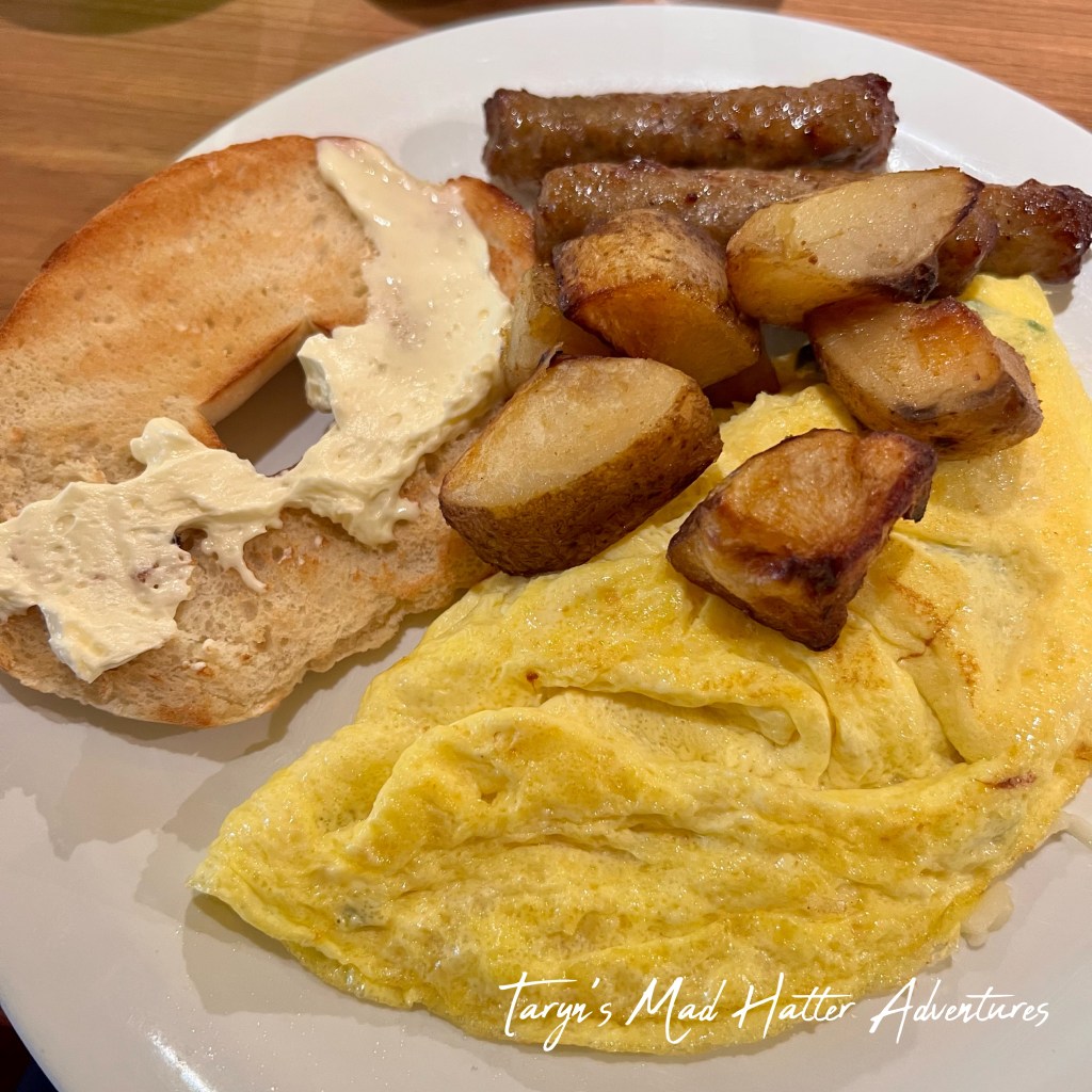 I had a made to order omelette, sausage, potatoes, and a bagel.