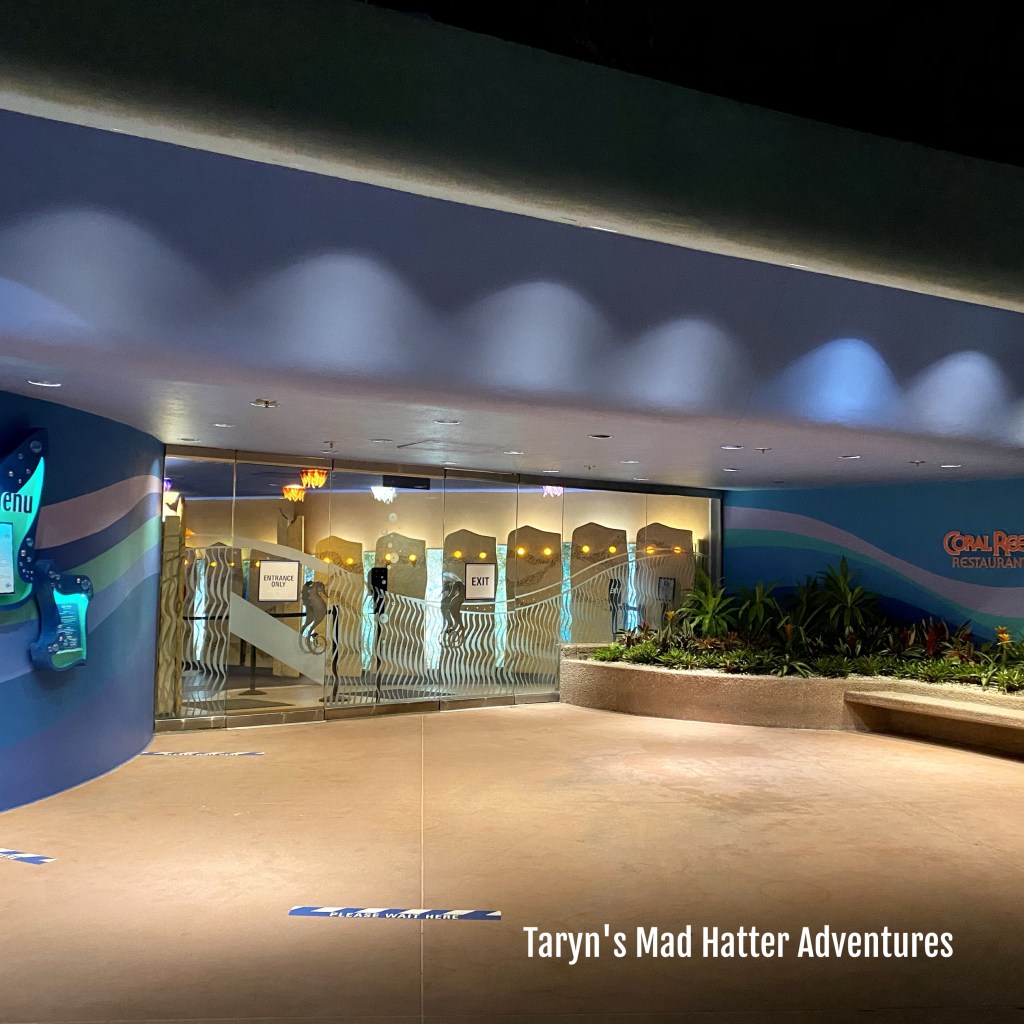 This is Coral Reef Restaurant, which is a table service location. Everything is one way in, one way out. Every dining location, shopping location, etc. Doors are specifically marked ENTER or EXIT only. They have limited indoor seating and are not using every table. If you want a table service meal, it’s very important that you have a reservation! I saw them turning people away if they didn’t have a reservation.