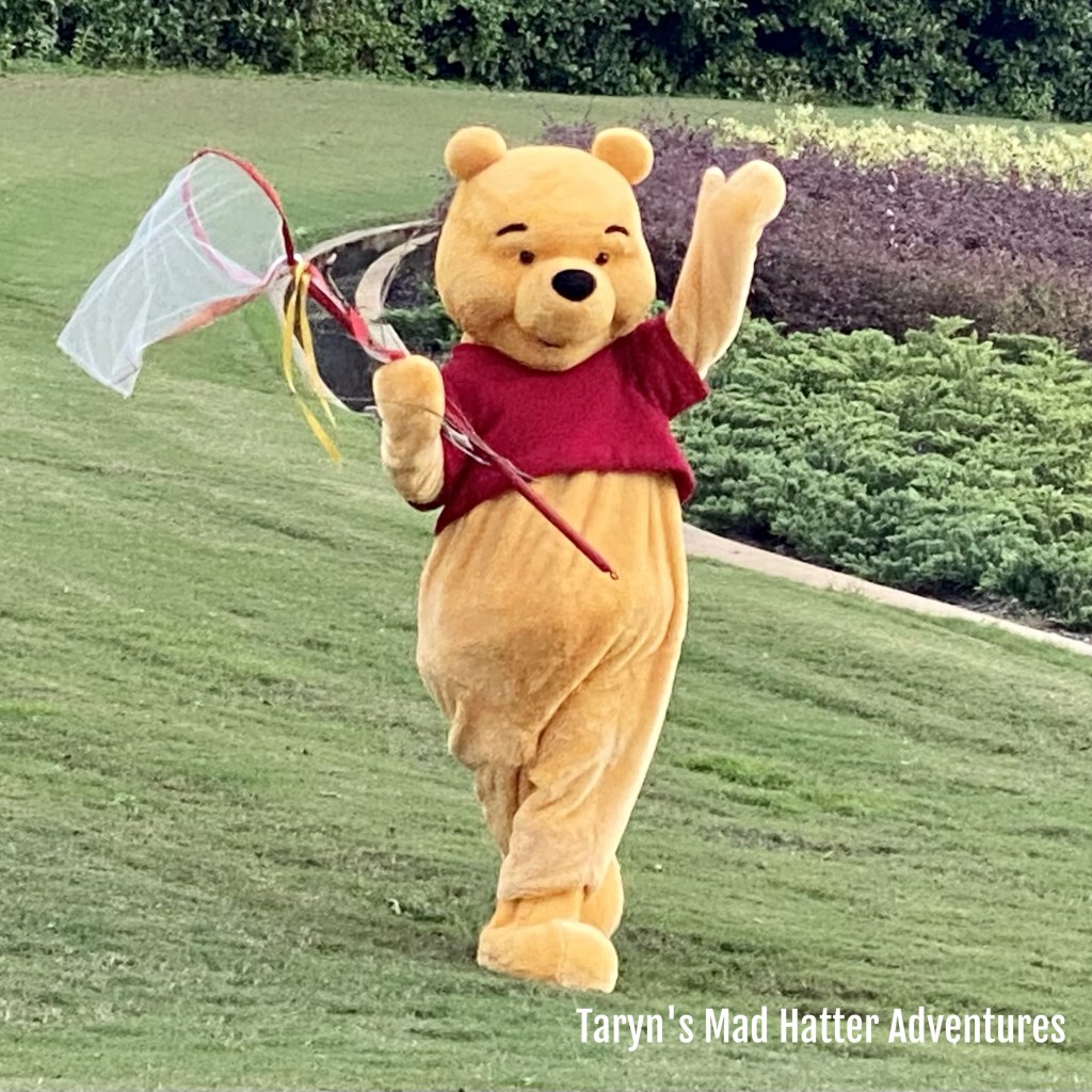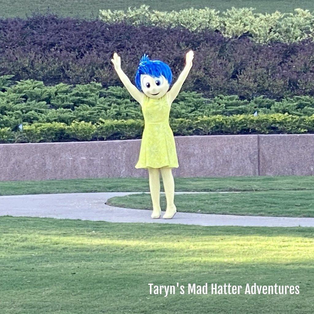While there are no character meet and greets available at the moment, there are characters out and about. We were able to see Joy and Pooh right outside of the Figment attraction.
