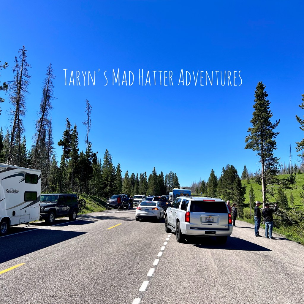 We had an exciting moment on the way to Old Faithful. There were tons of cars pulled over, and park rangers were out with cones directly traffic along. This could only mean one thing….