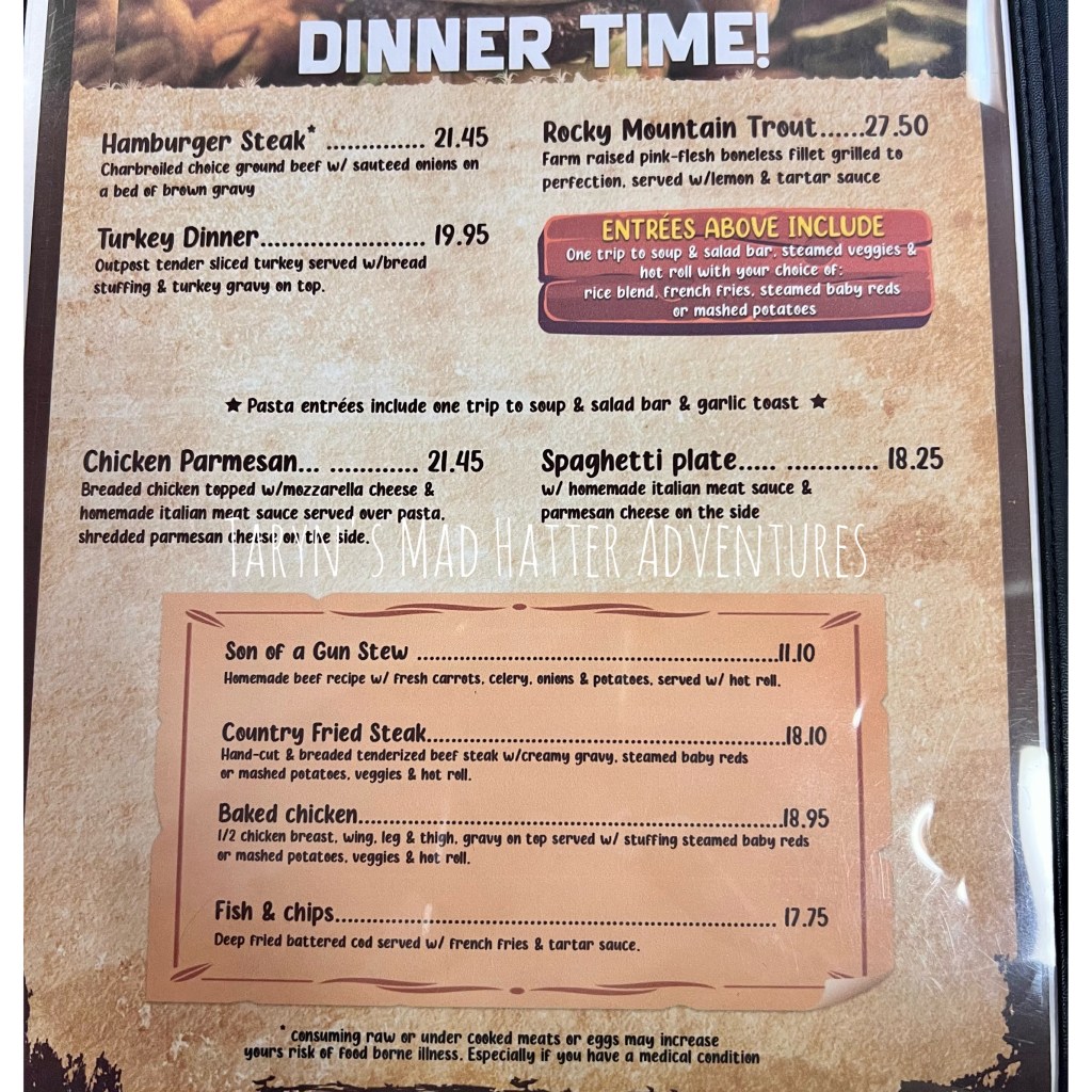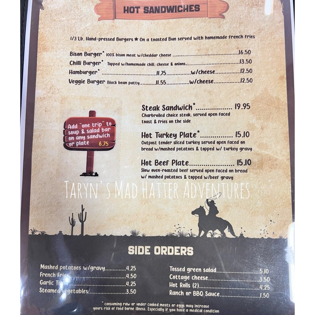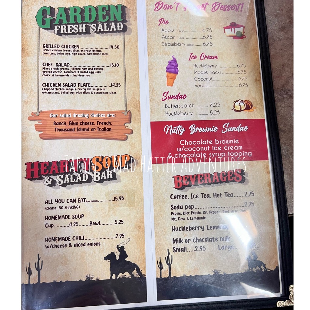 We exited the park at the west entrance. Our next hotel was in Island Park just south of West Yellowstone. We stopped for dinner in West Yellowstone because we had not had time to explore there yet. There were many fabulous, reasonably priced souvenir shops, and several restaurants to choose from. We decided on this one, which had good reviews online, and was located right near the shops where we were.