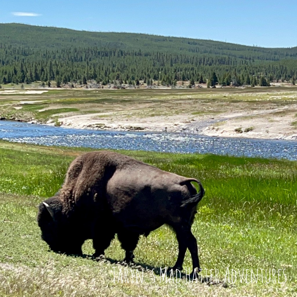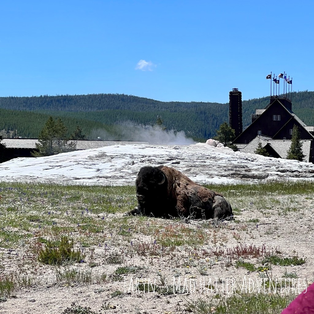 We were just in time for the geyser to go off! We walked around to this side where we were pleasantly surprised by a bison just laying around in front of it. There was a park ranger standing here as well just keeping tabs on him and his movement.